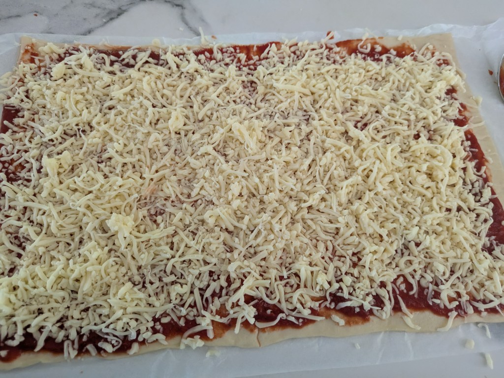 Als erstes rollt man den Pizzateig aus und bestreicht ihn mit Tomatensauce. Dann streut man Käse darauf.