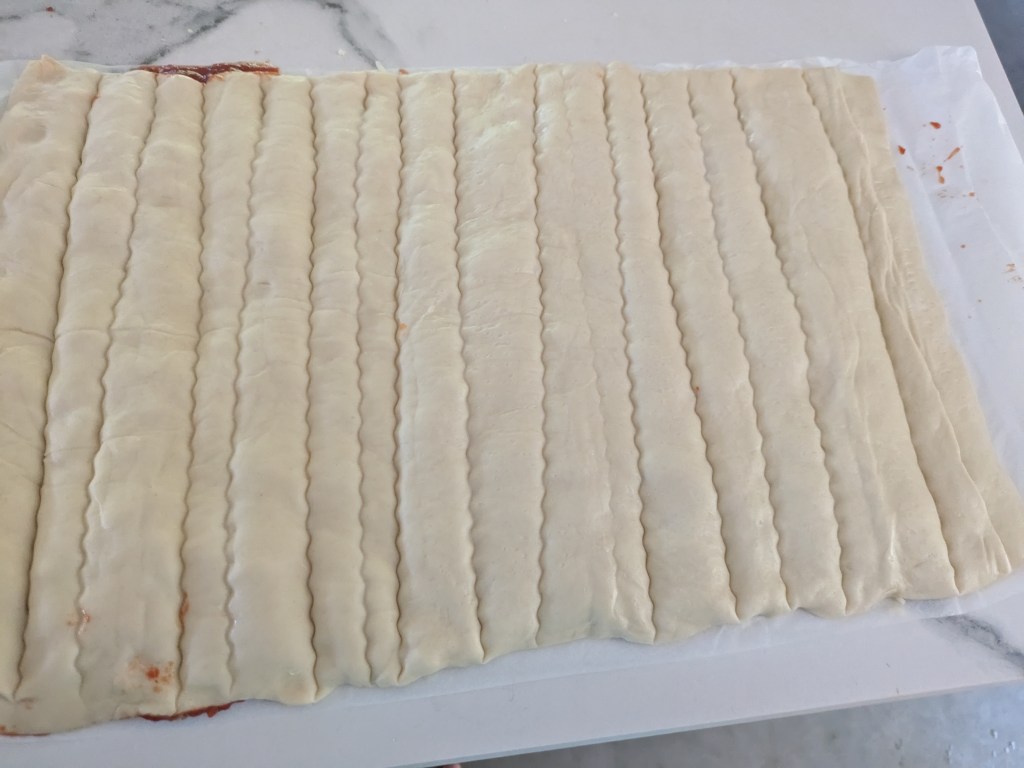 Im nächsten Schritt holt man den zweiten Pizzateig und legt ihn auf den ersten drauf. Man schneidet ihn dann so, wie es auf dem Bild gezeigt ist, in Streifen.